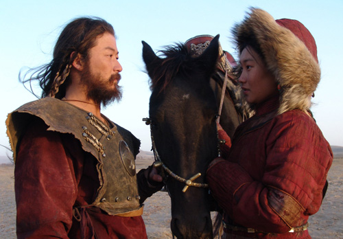 When you imagine a movie about Genghis Khan (I know you don’t do that very much, but humour me) you probably imagine vast armies of Mongol warriors on horseback following an imposing, charismatic commander with power showing in his face and strength in his voice. On the contrary, this movie presents the story of a relatively soft-spoken man who was outcast and defeated many times. In fact, this version of his story begins with him shackled in a jail cell, being told that the monk sent to find his wife had died. Because you know that he’s going to become a legendary conqueror, you know that this pitiful scene is just a stopover, but it is an interesting sight nonetheless. That the title of this movie is “Mongol”, rather than “Genghis Khan”, reflected the fact that this was as much a story of the Mongol people as it was about their most famous leader. This story of the early life of Temudgin (Genghis Khan’s original name) was also an exploration of the power-politics of this culture of hunter-gatherers. Director Sergei Bodrov and the rest of the people involved have really done an amazing job at recreating this past society, one which the North American audience (and probably the world-wide movie audience) knows very little about. Whether the events are historically accurate seems secondary to a peek at the way of life for this nomadic cluster of horsemen who at one time grew to rule the largest contiguous land empire in history.