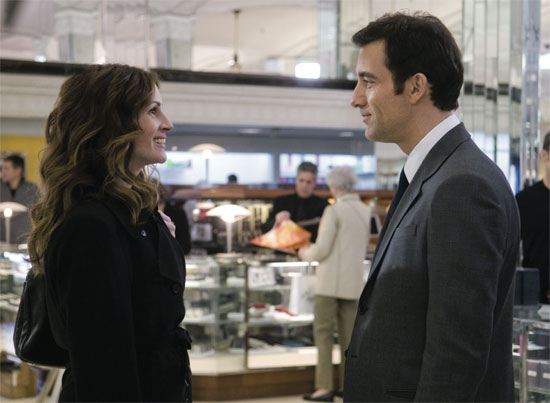 When you watch the trailer, you know this movie’s going to be fun. You’ve got Julia Roberts and Clive Owen as a pair of corporate spies, dancing a romantic tango while play both sides of a con job on two competing Proctor & Gamble-sized mega-corporations. This movie could have been a cakewalk for both the lead actors: just smile smugly, hit your mark, and act more clever than a everyone else. Instead the movie is actually pretty smart — to the point of being a little confusing. Give credit to writer-director Tony Gilroy, who also wrote the Bourne trilogy (awesome!) and Devil’s Advocate (oops!). Beginning with Roberts as Claire Stenwick, a CIA agent who seduces Owen’s Ray Koval, drugs him, and steals his intel. Skip forward to the present, when Claire and Ray have teamed up to con their way into a $40 million retirement fund. The best thing about this movie is that it stays one step ahead of the audience, revealing various plot twists only in flashbacks.