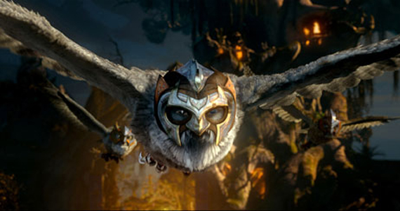I confess there’s no way to write a synopsis of this movie without it sounding kind of silly (and some of the dialogue is a bit laughable). However, the amazing visuals will easily banish away smirks or giggles. First, the owls are very well animated. They look super realistic (down to the feathers), and even manage to show some human mannerisms. Plus, you can actually tell the owls apart (which is a huge plus for any story with only non-human characters). Second, when the owls take flight or attack, the movements and the backgrounds, the slow motion, etc., all look incredible. There’s one scene where Soren learns to fly into the eye of a thunderstorm. The raindrops not only whip through the air as he’s speeds through, but when the slow motion kicks in, every single droplet can be clearly seen swirling around his body. It’s quite awesome. (If there’s anyone who knows how to use slo-mo, it’s 300 and Watchmen director Zack Snyder.)