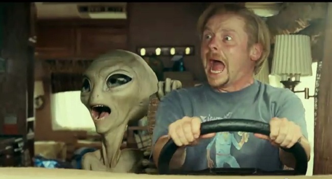 Anyway, Graeme (played by Simon Pegg) and Clive (played by Nick Frost) are two British buddies who take a long-dreamed-about trip to San Diego for the Comic-con festival and decide to conclude their visit to the US with a road trip to all the site famous to UFO fans. Along the way, they do those typical road trip movie things such as eat in a small-town diner, get in trouble with the local red-necks; inadvertently fall within the radar of law enforcement; catch the eye of a farmer’s innocent daughter (though this time it’s not a farm but a trailer park) and incur the wrath of her Bible-thumping pappy. Last but not least, they pick up a stranded motorist whose care-free ways help them to see their lives in a new way — oh, and he’s a space alien named Paul. Besides that last bit, these are all text-book elements of those road-trip buddy comedies that I really loathe: everything from Dumb & Dumber, to Harold & Kumar, to The Hangover. Unfortunately, relying on such obvious cliches ensures that you can see everything coming from miles and miles away.