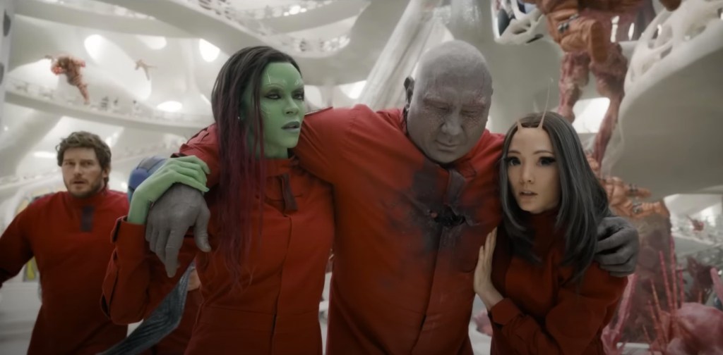 One of the funnest parts was the heist sequence where the Guardians needed to steal some information from the biotech company who patented (?) the experiments on Rocket (Wait, does that make sense? Did they High Evolutionary work for that company? I thought he was hundreds of years old. How could he have been with that company, and how come the two are not connected within the movie? I’m confused.) The whole sequence was fun and hilarious, with some light-hearted Quill-Gamora banter, and a wonderful cameo from smart-mouthed Captain Mal himself, Nathan Fillion. To add to that quirkiness, the place had a squishy, bouncy aesthetic that made the whole planet/company feel like something from Rick and Morty given flesh. Mantis and Drax have been perfecting their comedic double-act for a while (including the Christmas special on Disney+) and they were so funny in these scenes as well (at least until the fighting began).