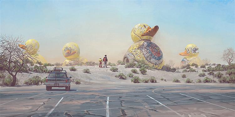 I think all they wanted from the book was its aesthetic. This can be seen in a number of tableaus and images in the movie where we see unique elements taken directly from illustrations in the book, including a giant derelict robot sitting slumped over; huge novelty ducks showing actual battle damage, broken and abandoned; a person plugged into VR headgear passed out/dead at the side of the road; and an iconic image of the robot brother Christopher pulling a long inflatable kayak across the desert as he and Michelle make their way.