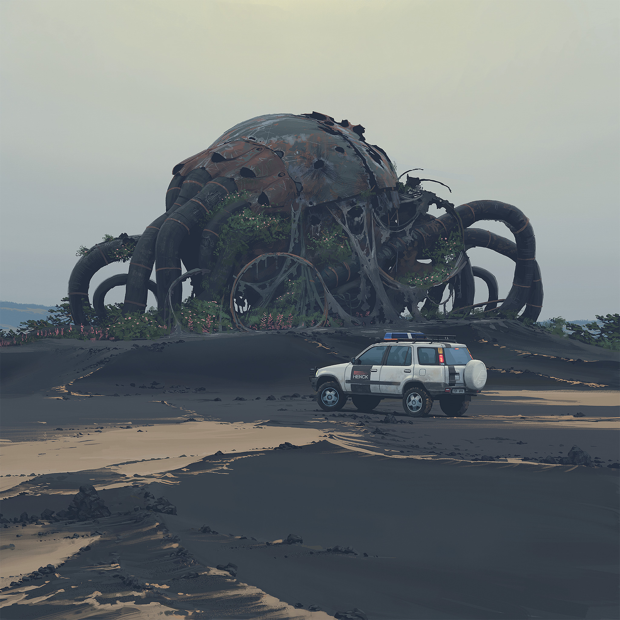 Experienced in sequence, Stålenhag’s books started out with less story, and more as narrative flashes and descriptive glimpses which built up this alternate world from loosely connected pieces. With The Electric State, there was more of a plot, and a set of protagonists who went on a quest to reach the coast. Now with Sunset at Zero Point (which was titled “Swedish Machines” in its original Kickstarter edition), we are exclusively following the story of two young men, Linus and Valter, and their relationship over a few decades. They live in the small town called Torsvik, which is on the edge of an exclusion zone which was once contaminated by the development and testing of a major weapon known as the Tetrahedron. After the failure of that work, the area was closed off and left to be managed by the company that Valter works for as a security guard. He is very interested in the heart of this zone, known as the Black Fallow, and sneaks out with the company vehicle, equipment and brings Linus along, to explore and scavenge.